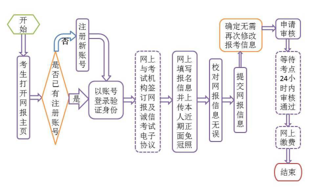 第二步:考生网上缴费。考生等待考点24小时之内审核通过后上网缴纳考试费即可。流程如下图:
